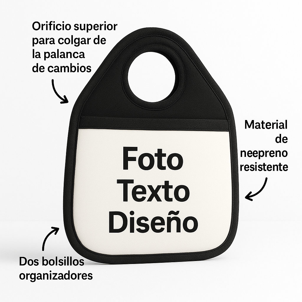 Fabricado en neopreno resistente, este práctico accesorio se cuelga fácilmente en la palanca de cambios y te ofrece dos bolsillos espaciosos para guardar desde tu celular hasta tus anteojos o recibos. Su diseño compacto y funcional lo hace compatible con la mayoría de los autos y perfecto para mantener todo a mano sin perder estilo.