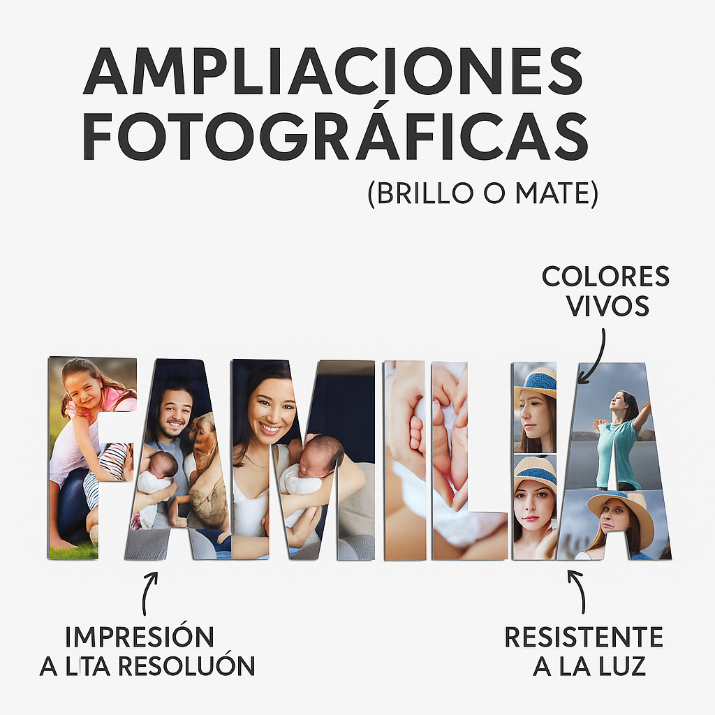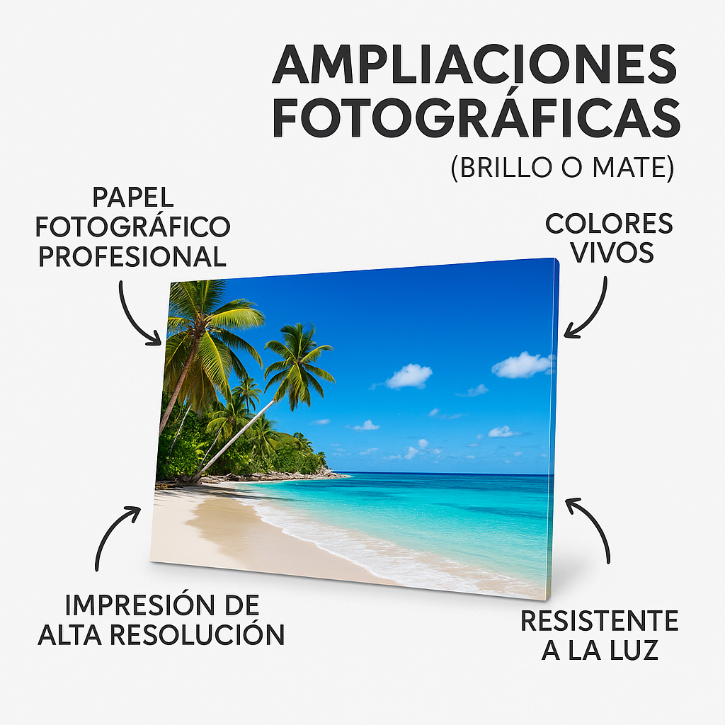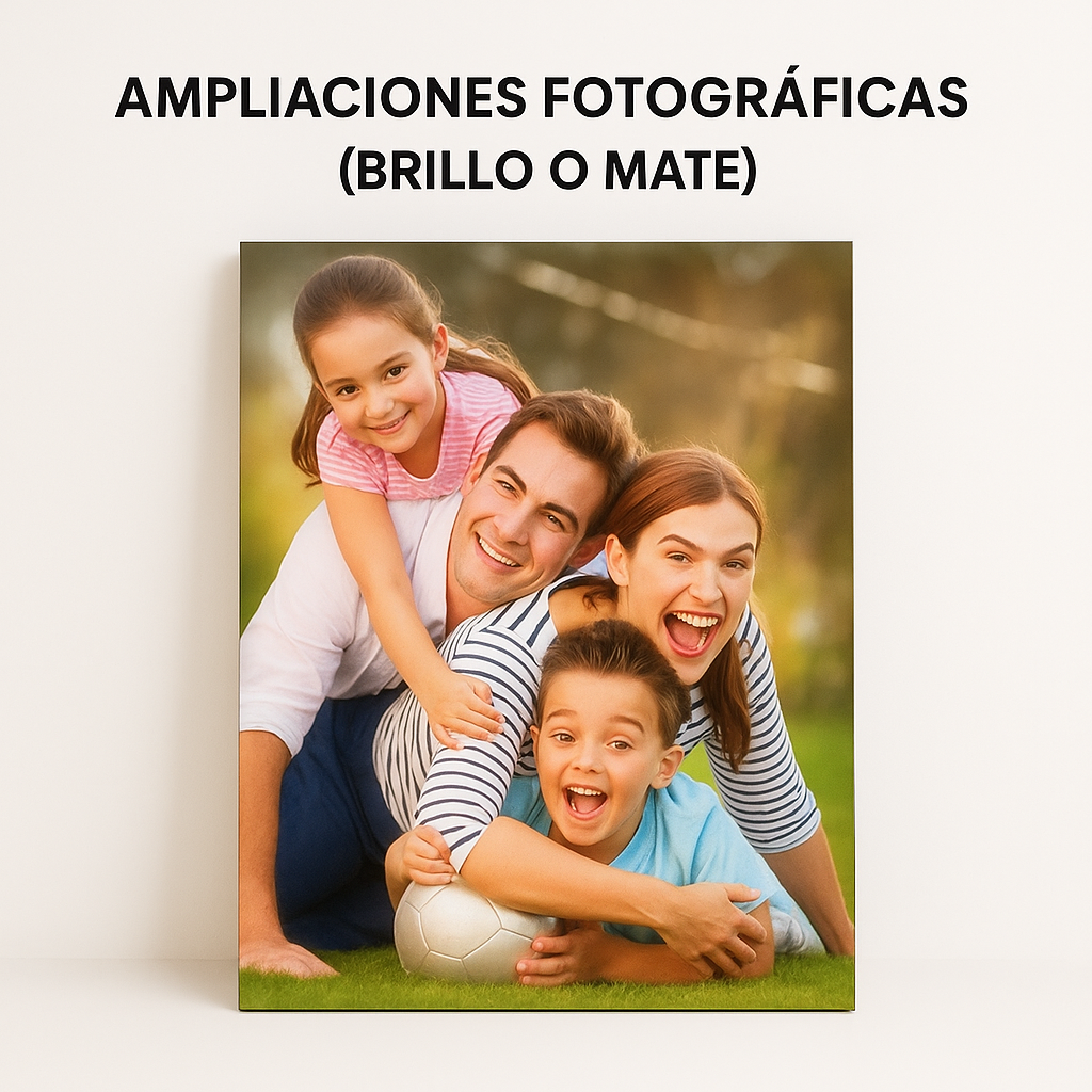 Las ampliaciones fotográficas de TecPic son impresiones de alta resolución en gran formato, disponibles desde 30x40 cm hasta 70x100 cm. Se realizan en papel fotográfico profesional con opciones de acabado Brillante (para colores vibrantes) o Mate (antirreflejo y elegante), garantizando durabilidad y nitidez superior para decoración o exposiciones.