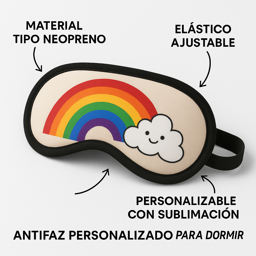 En TecPic Store creamos antifaces de descanso en material tipo neopreno suave con ajuste elástico. Personalizalo con tu foto, frase o logo mediante sublimación de alta calidad. Ideal para viajes, meditación o para regalar un descanso perfecto.