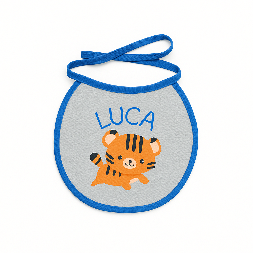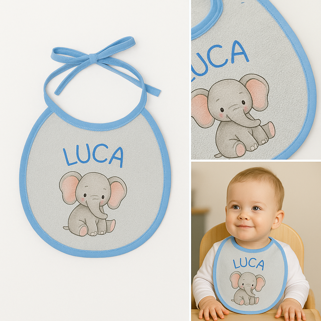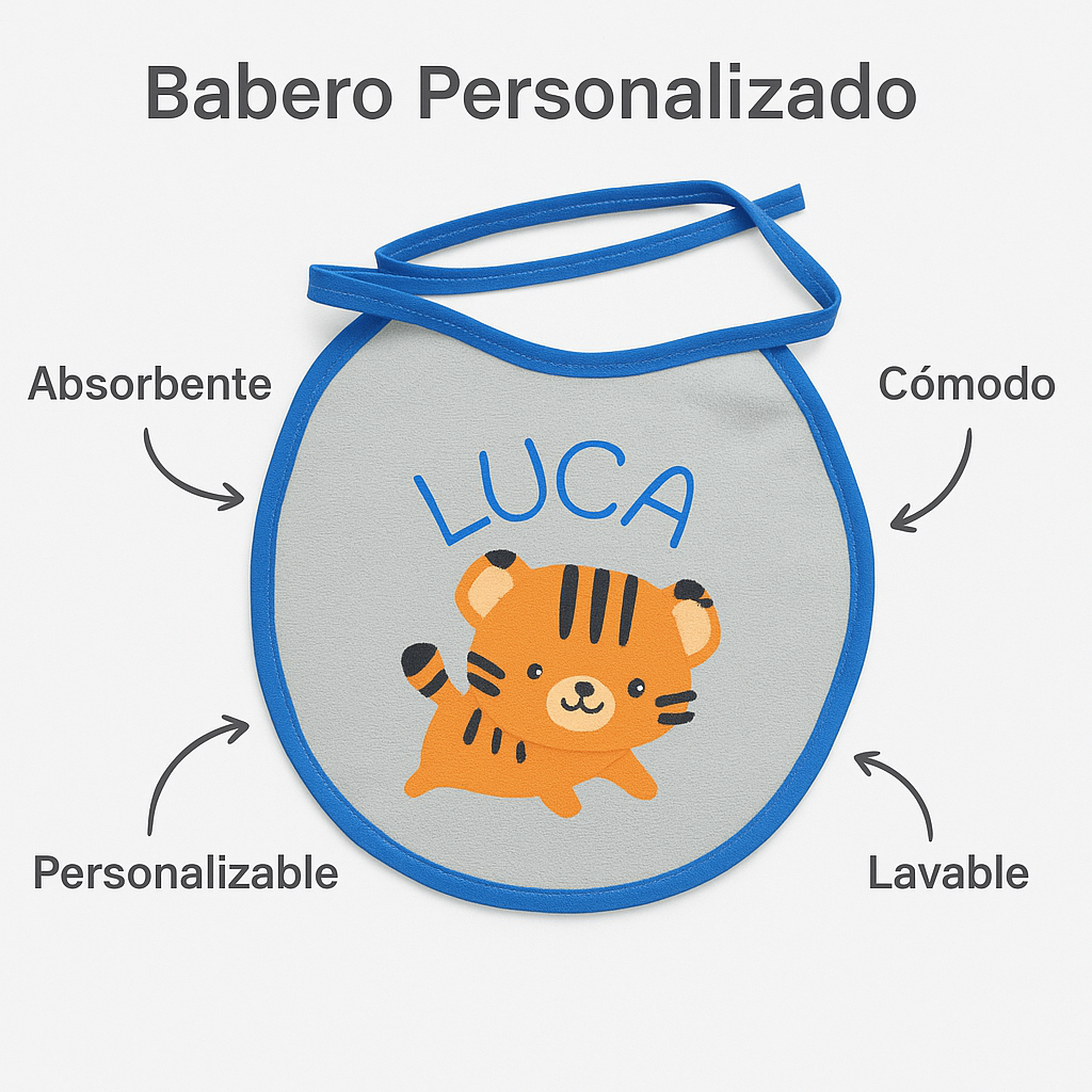 Es un babero de tela tipo toalla, ultra absorbente y suave, diseñado para proteger la ropa de tu bebé con estilo. Podés personalizarlo con su nombre, personajes, fotos o logos, eligiendo el color de los bordes. Ideal para regalar o usar todos los días.