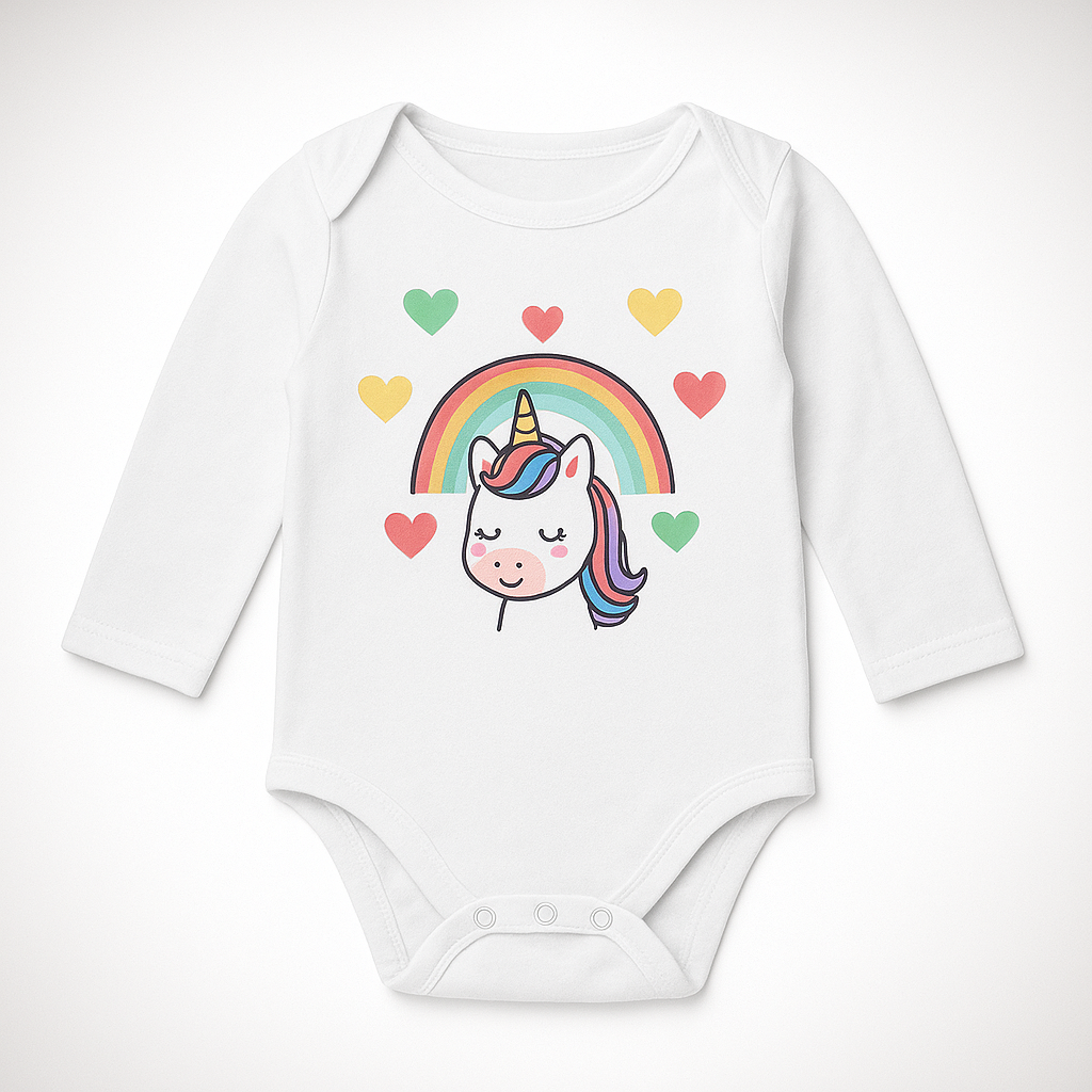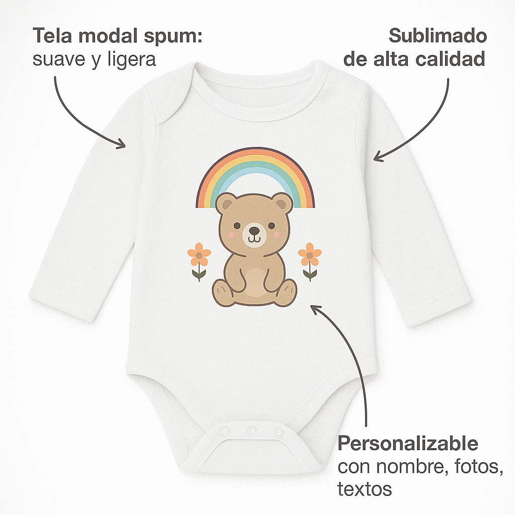El body personalizado de manga larga para bebé es una prenda única confeccionada en suave tela modal spum. Diseñado para estampar nombres, fotos, frases o diseños exclusivos en calidad premium (tamaño A4). Disponible en color blanco desde el talle 1 al 6, es la opción perfecta para inmortalizar recuerdos en nacimientos, bautismos o fechas especiales.