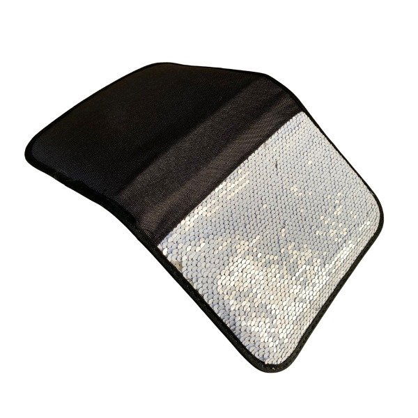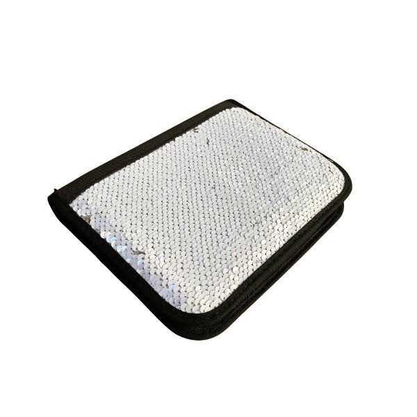 Es un estuche escolar o de oficina de un piso fabricado en cordura negra, con un frente de lentejuelas mágicas reversibles. Podés estampar tus fotos, logos o frases en el lado blanco y cambiar al lado plateado con solo pasar la mano.