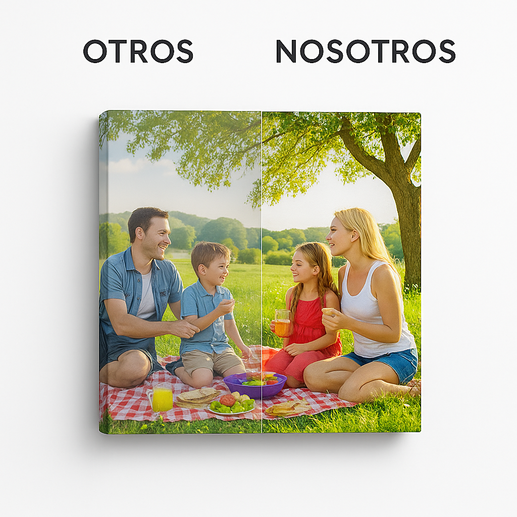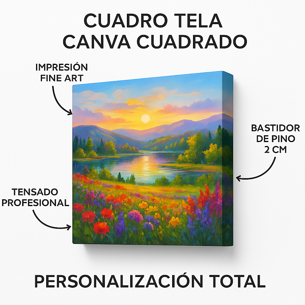 Es una impresión de alta definición sobre auténtica tela de lienzo (no lona plástica), montada artesanalmente sobre un bastidor de pino de 2 cm de espesor. Gracias a su tecnología Fine Art, transforma tus fotos digitales en obras de arte con calidad de galería, ofreciendo colores vibrantes y una durabilidad superior sin deformarse.