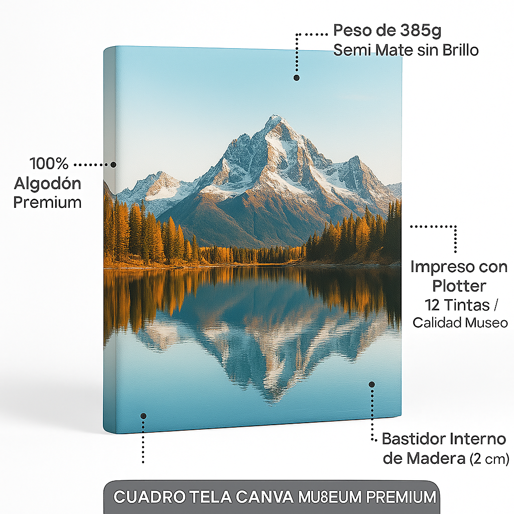 El Cuadro Tela Canva Museum Premium de TecPic es una impresión de alta gama sobre lienzo 100% algodón Canson® Infinity de 385g/m². Utiliza tecnología de 12 tintas Canon para lograr calidad "Fine Art" o de museo, garantizando colores vivos, negros profundos y una durabilidad superior a 100 años sin decolorarse, montado artesanalmente sobre un bastidor de pino listo para colgar.