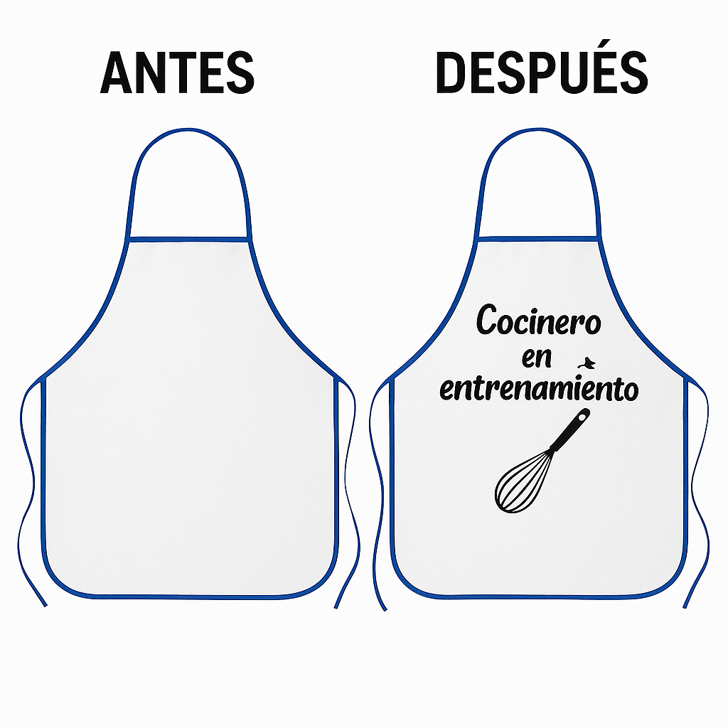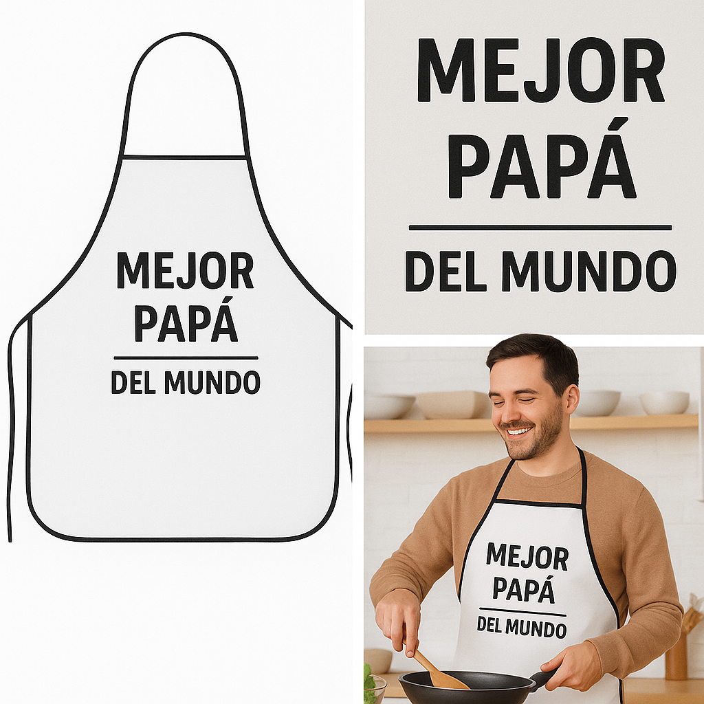El delantal de cocina personalizado de TecPic Store es el regalo perfecto para chefs y parrilleros. Está confeccionado en tela blanca resistente con bies de colores y te permite estampar la foto, frase o logo que quieras (tamaño A4) con una calidad de impresión increíble y súper duradera.