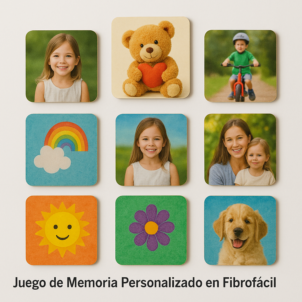 Es un memo test de fibrofácil compuesto por 10 fichas (5 pares) de 6x6 cm, diseñado a medida con tus fotos, logos o ilustraciones favoritas. Es el juego ideal para estimular la mente de grandes y chicos mientras se divierten con recuerdos inolvidables.