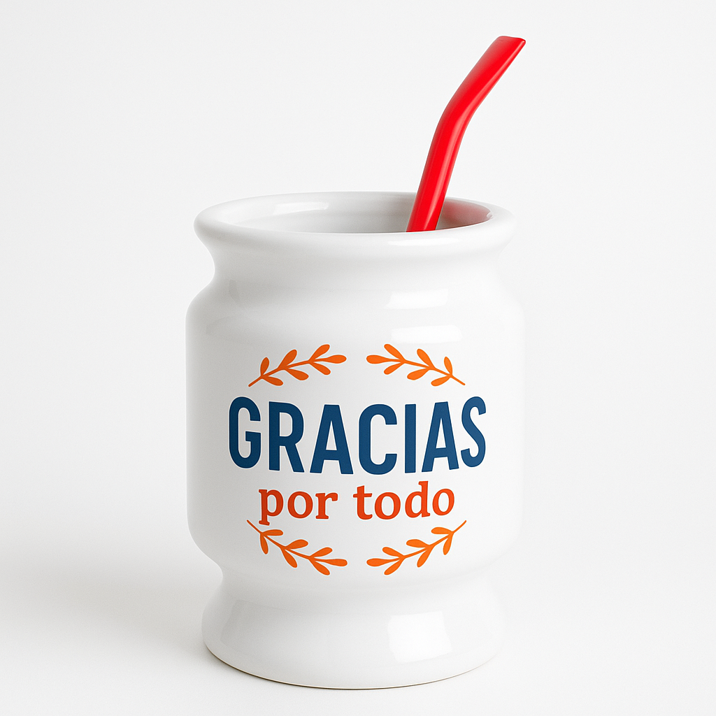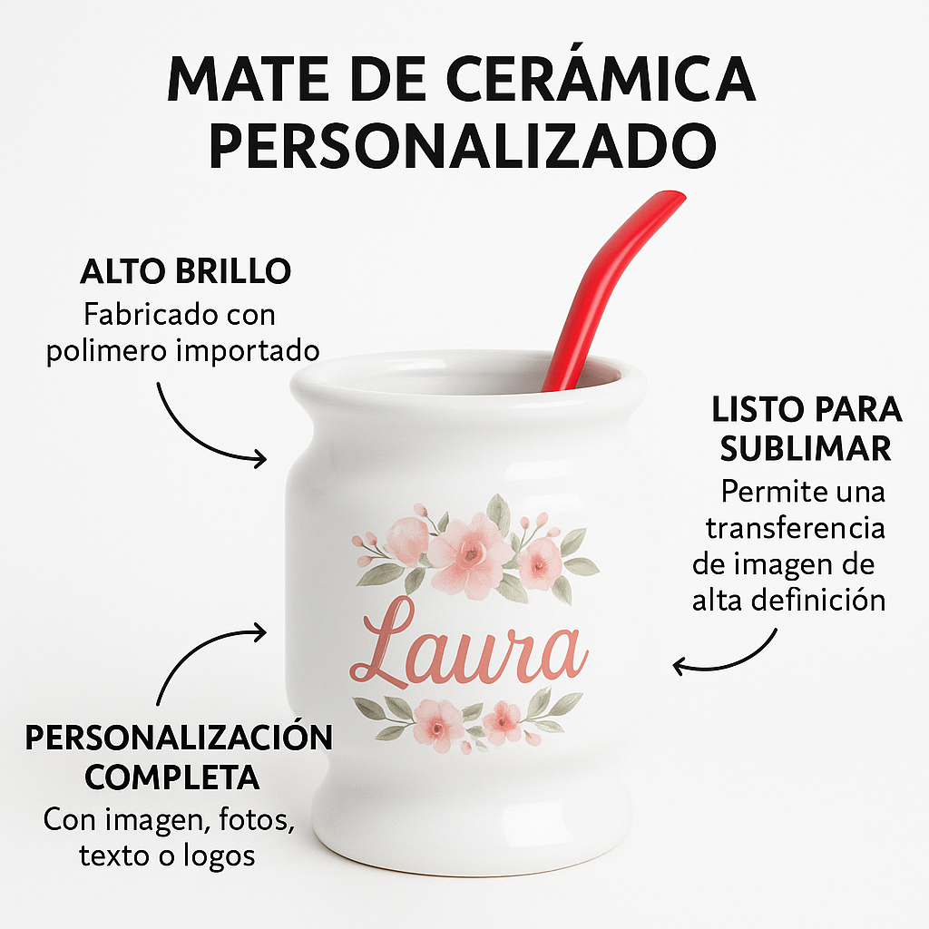 Es un mate de cerámica de alto brillo, recubierto con polímero importado, que podés estampar con fotos, nombres, logos o frases en alta definición. Incluye bombilla plástica reutilizable, siendo el regalo ideal para inmortalizar tus mejores momentos mientras disfrutás de la tradición del mate.