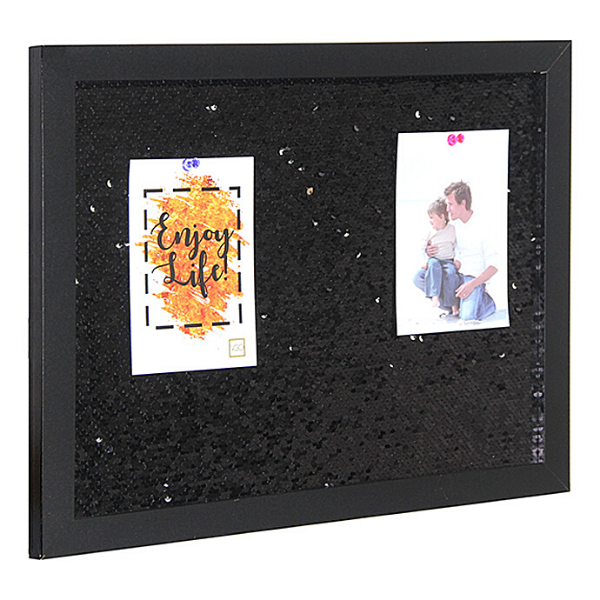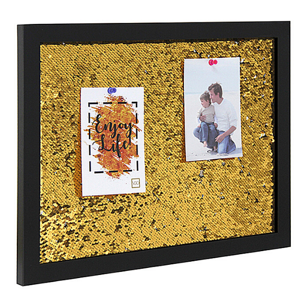 Es un tablero organizador decorativo de 35x45 cm con acabado Glitter Premium (Dorado o Plateado), diseñado para utilizarse como una pizarra de corcho tradicional. Permite fijar fotografías, notas y recordatorios mediante chinches, combinando funcionalidad y una estética glam ideal para renovar cualquier espacio de trabajo o habitación.