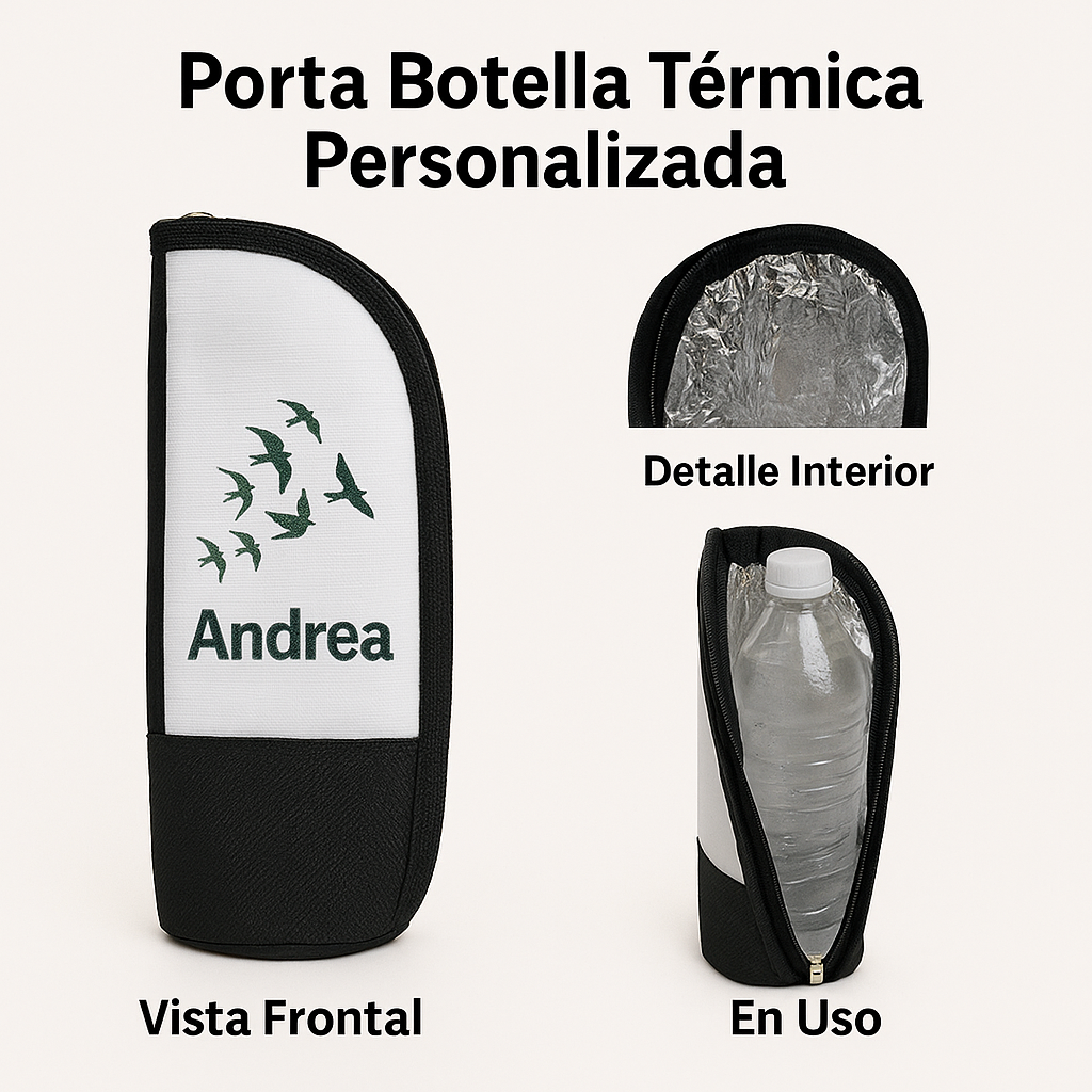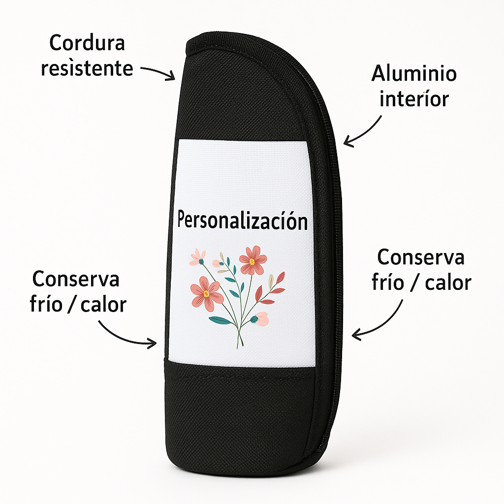 Es una funda fabricada en cordura de alta resistencia con interior de aluminio térmico, diseñada para mantener tus bebidas frías o calientes por más tiempo. Ideal para termos, mamaderas y botellas de hasta 600 ml, se puede personalizar al 100% con tu nombre, logo o foto favorita.