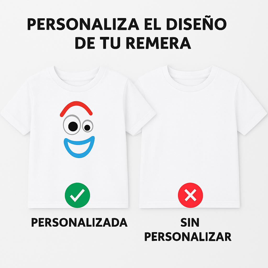 3. ¿Qué pasa si el talle no le queda? Al ser un producto personalizado con tu foto o nombre, no tiene cambio por talle (salvo falla de fábrica). Por eso, es fundamental que compares una remera que le quede bien al niño con nuestra tabla de medidas (ancho de axila a axila y largo) antes de comprar.