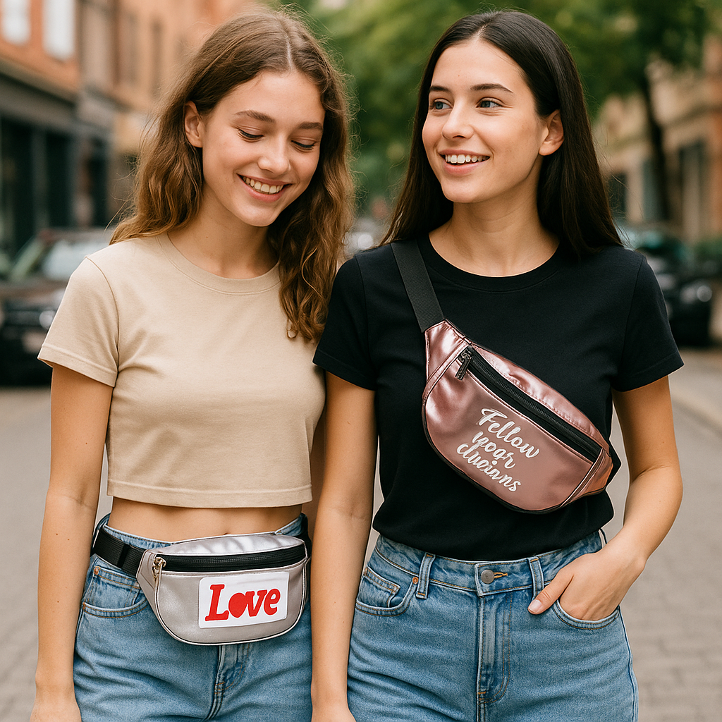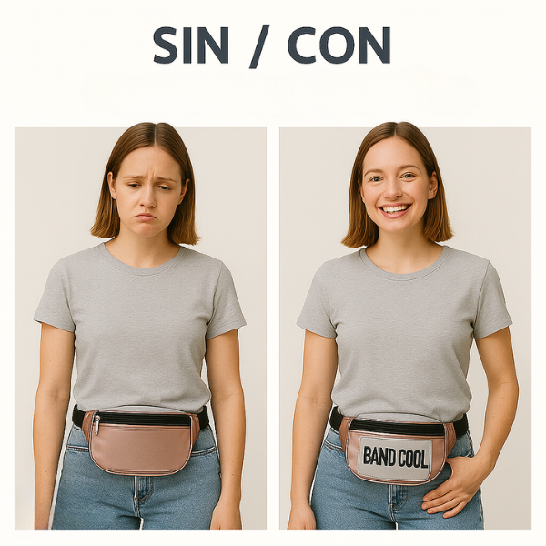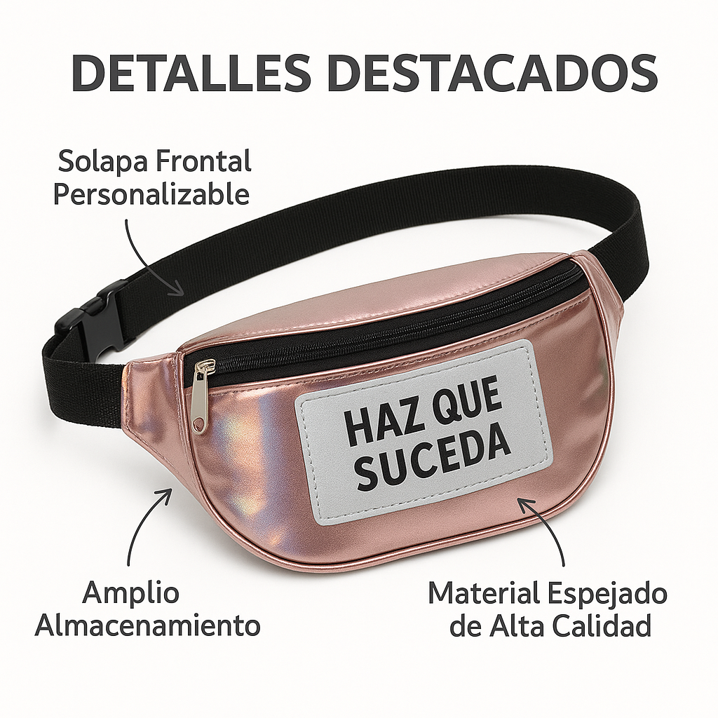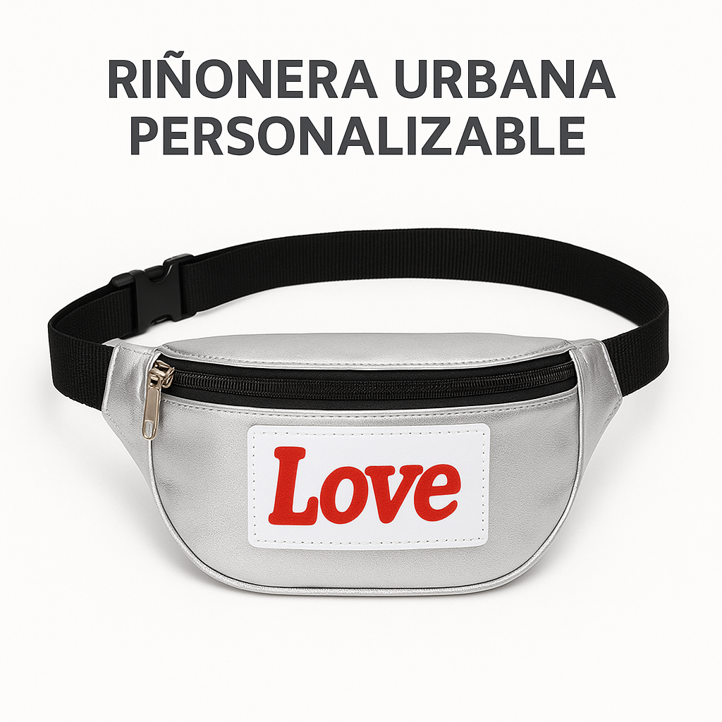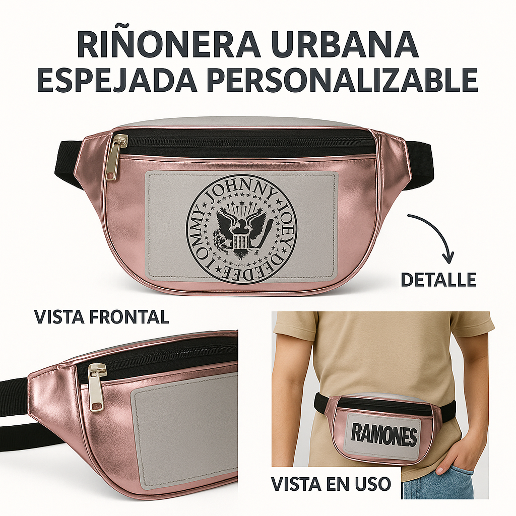 Es una riñonera urbana de edición limitada, fabricada en un material brillante de alta resistencia (rosa metálico o plata). Cuenta con una solapa de símil neopreno 100% personalizable para que estampes fotos, frases o tu propio diseño, combinando moda, actitud y practicidad en tu día a día.
