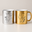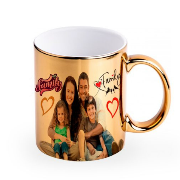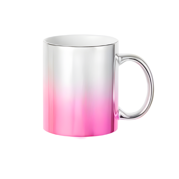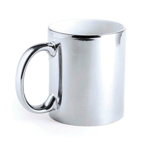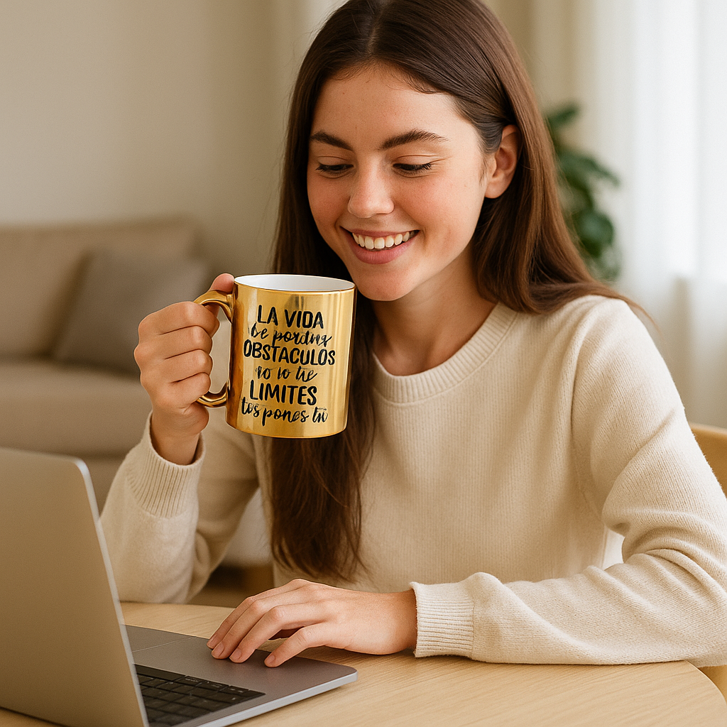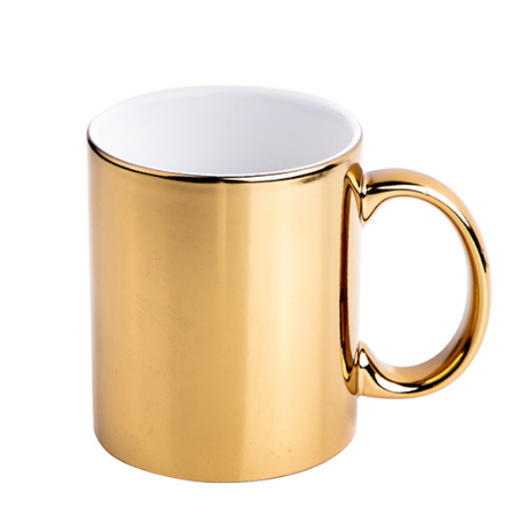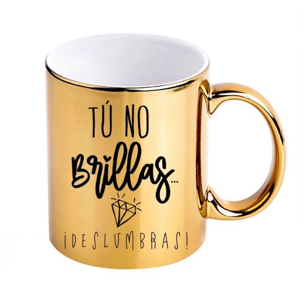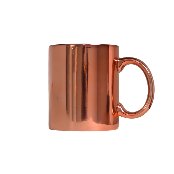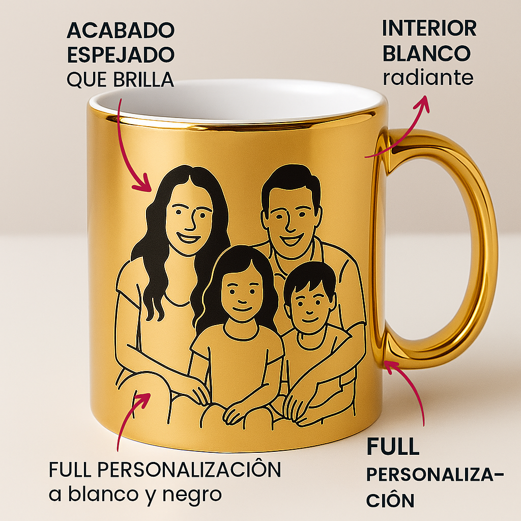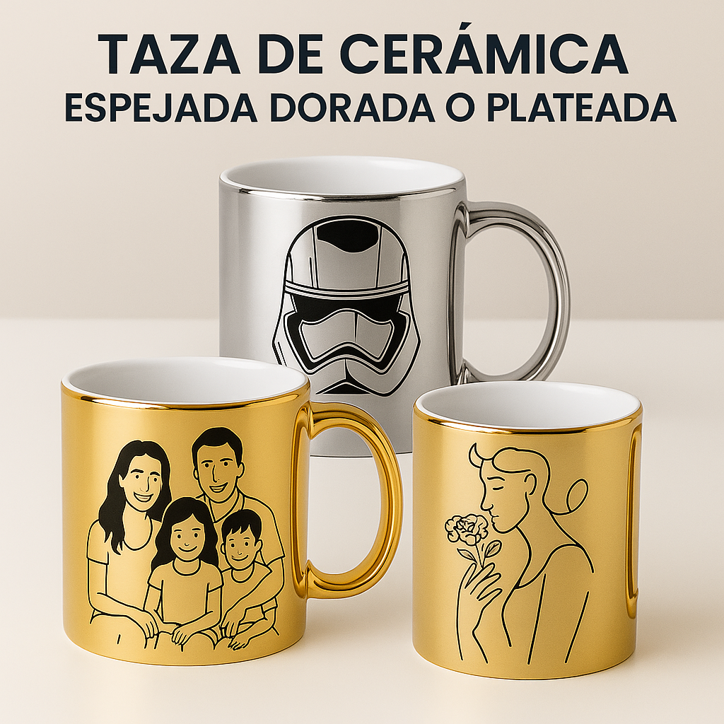 Es una taza de cerámica premium con acabado metalizado (Gold, Silver, Rose o Green) que logra un efecto espejo brillante único. A diferencia de las tazas comunes, su superficie refleja la luz y el entorno, permitiendo personalizarla con diseños, frases o logotipos (preferentemente en color negro) que destacan con elegancia sobre el fondo metálico.
