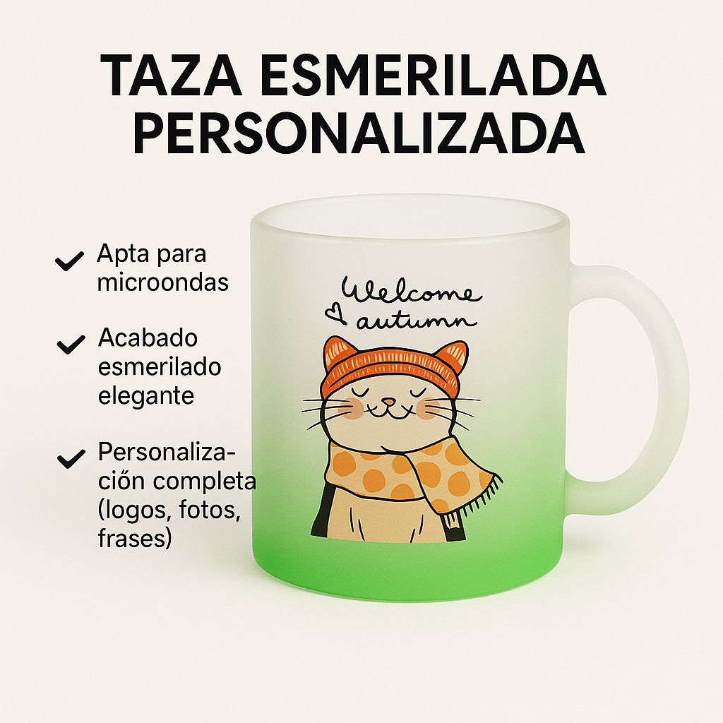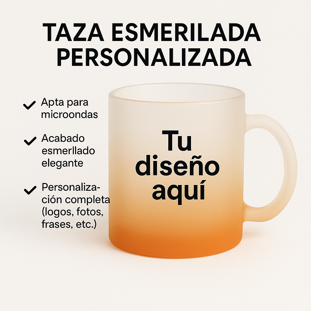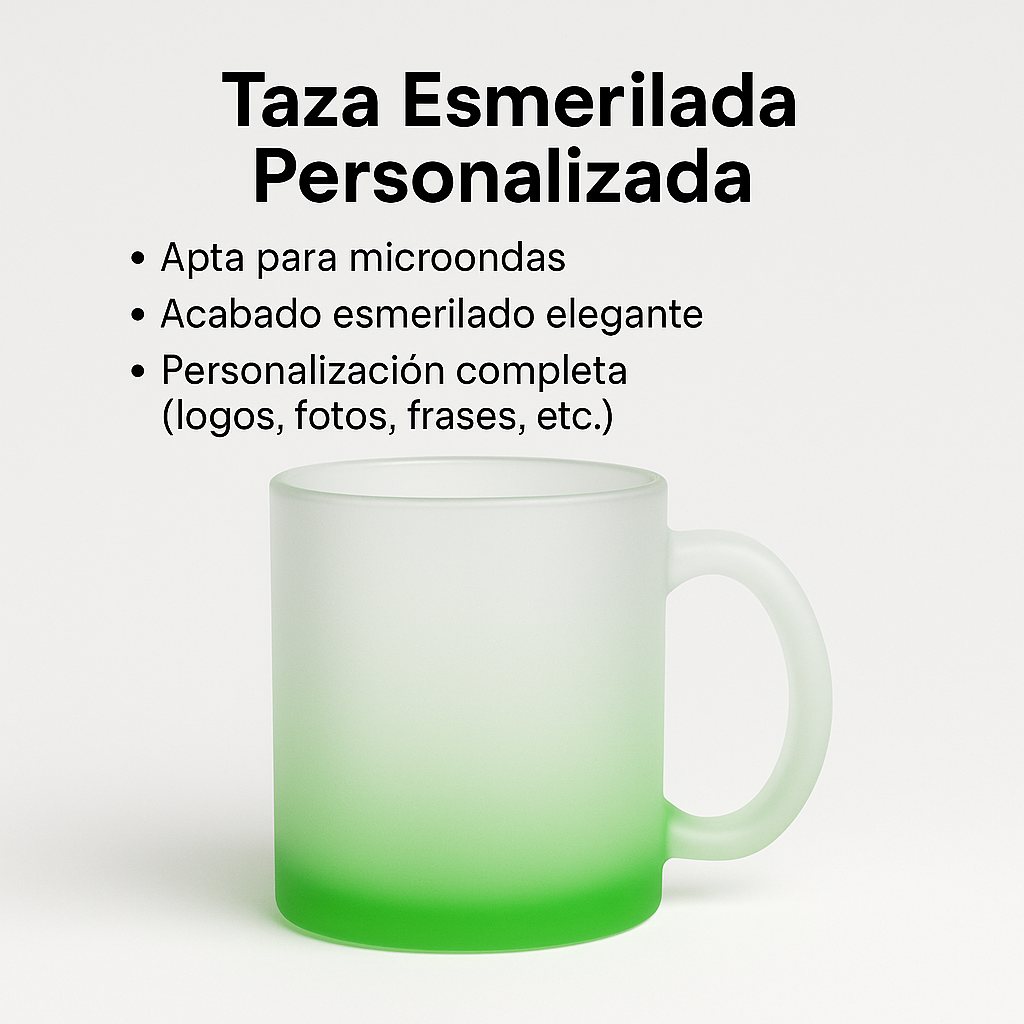 La taza esmerilada personalizada es un mug de vidrio con un tratamiento especial "frosted" (efecto hielo) que le otorga una textura suave y traslúcida única. En TecPic, sublimamos este producto con calidad fotográfica de alta definición, garantizando que tus imágenes, logos o frases se vean vibrantes y elegantes, siendo además una de las pocas opciones de vidrio en el mercado aptas para microondas.