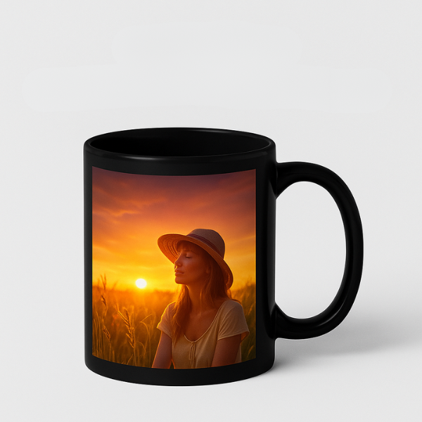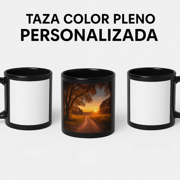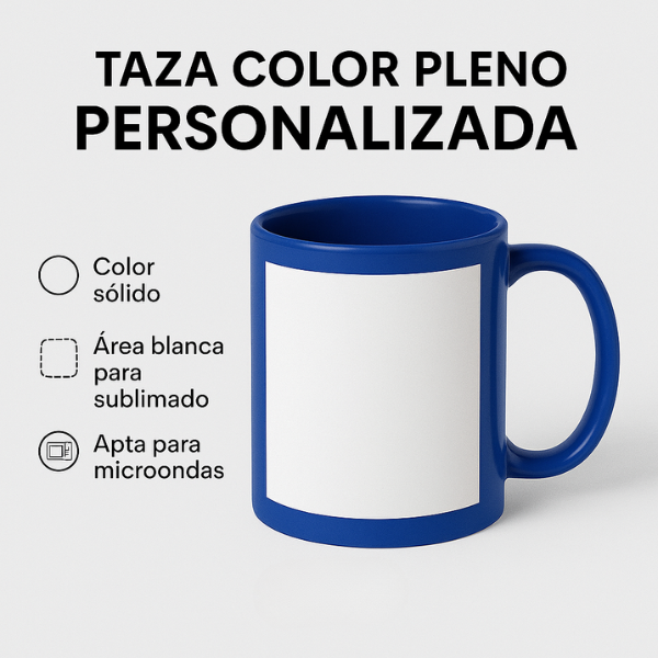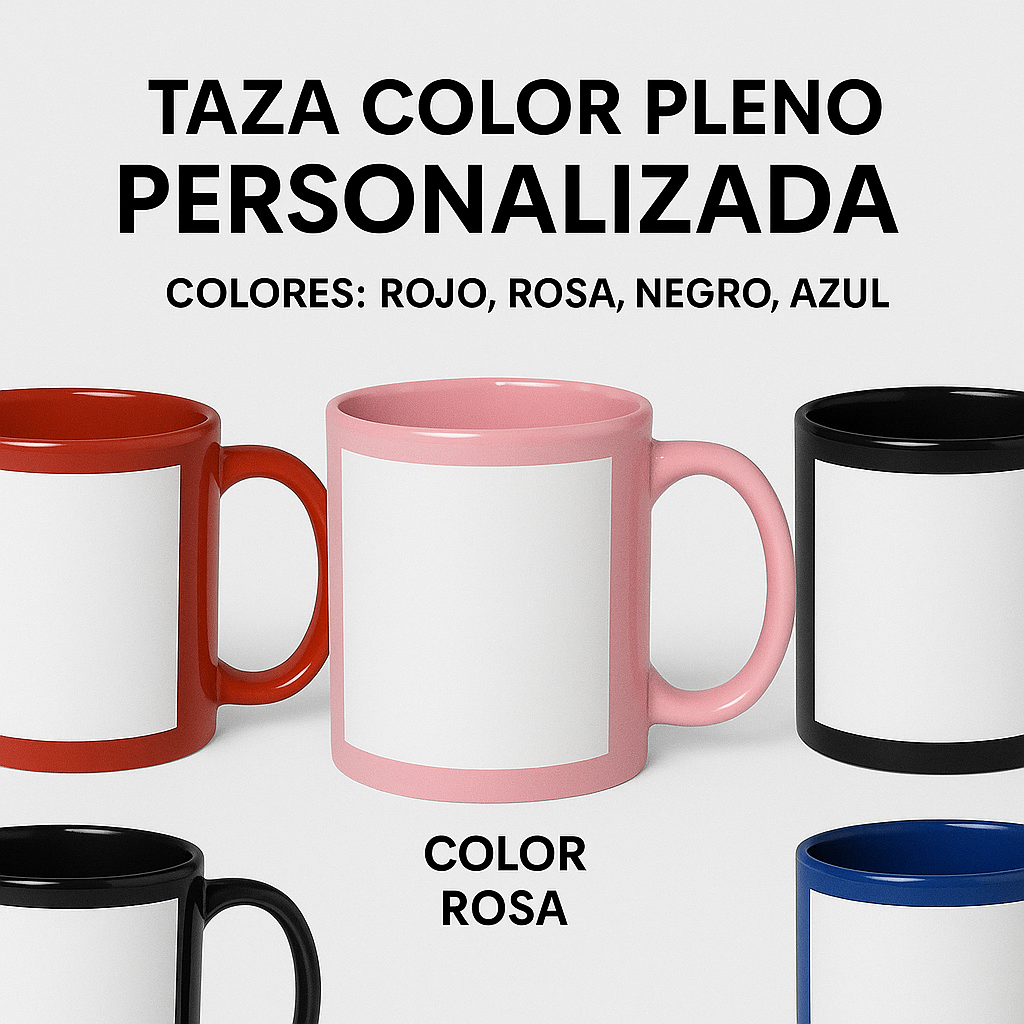 Es una taza de cerámica premium de 11 oz que posee un fondo de color intenso (rosa, rojo, azul o negro) en su totalidad, excepto en un recuadro blanco o "ventana" reservado para la impresión. Este diseño permite estampar fotografías con colores reales y máxima nitidez, evitando que la imagen se oscurezca al mezclarse con el color de base de la taza.