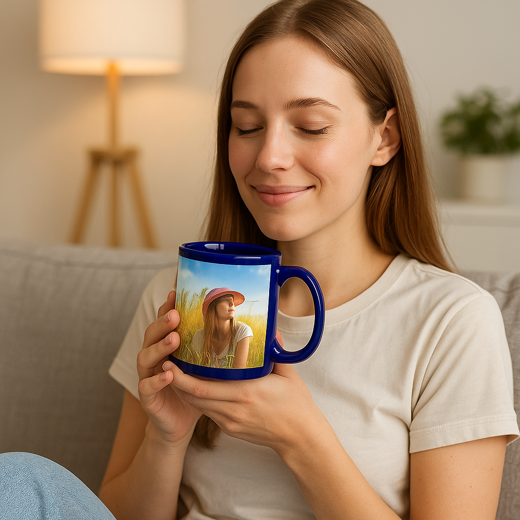 Hemos combinado lo mejor de dos mundos: la elegancia de una taza de color vibrante y la calidad técnica de un área de impresión blanca pura. Al imprimir sobre la "ventana" blanca, garantizamos que los tonos de piel, paisajes y logotipos mantengan su fidelidad original, mientras el resto de la taza aporta ese toque de color que combina con la personalidad del agasajado.