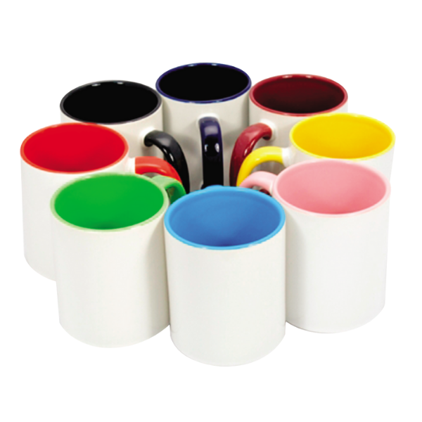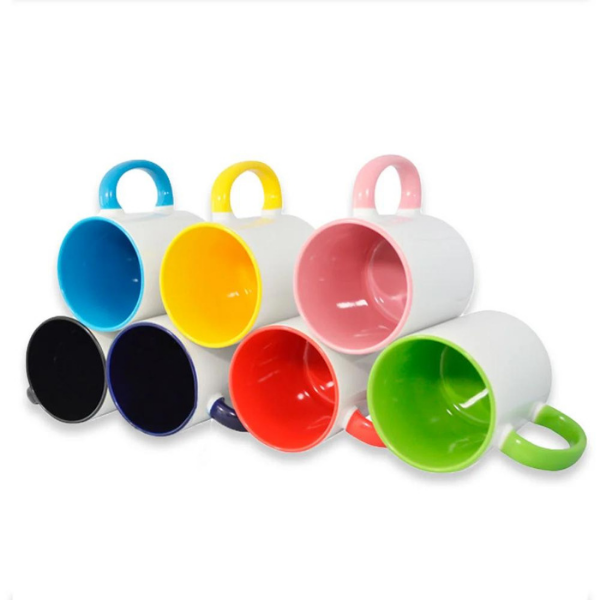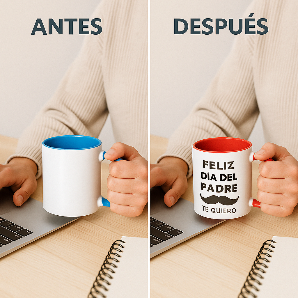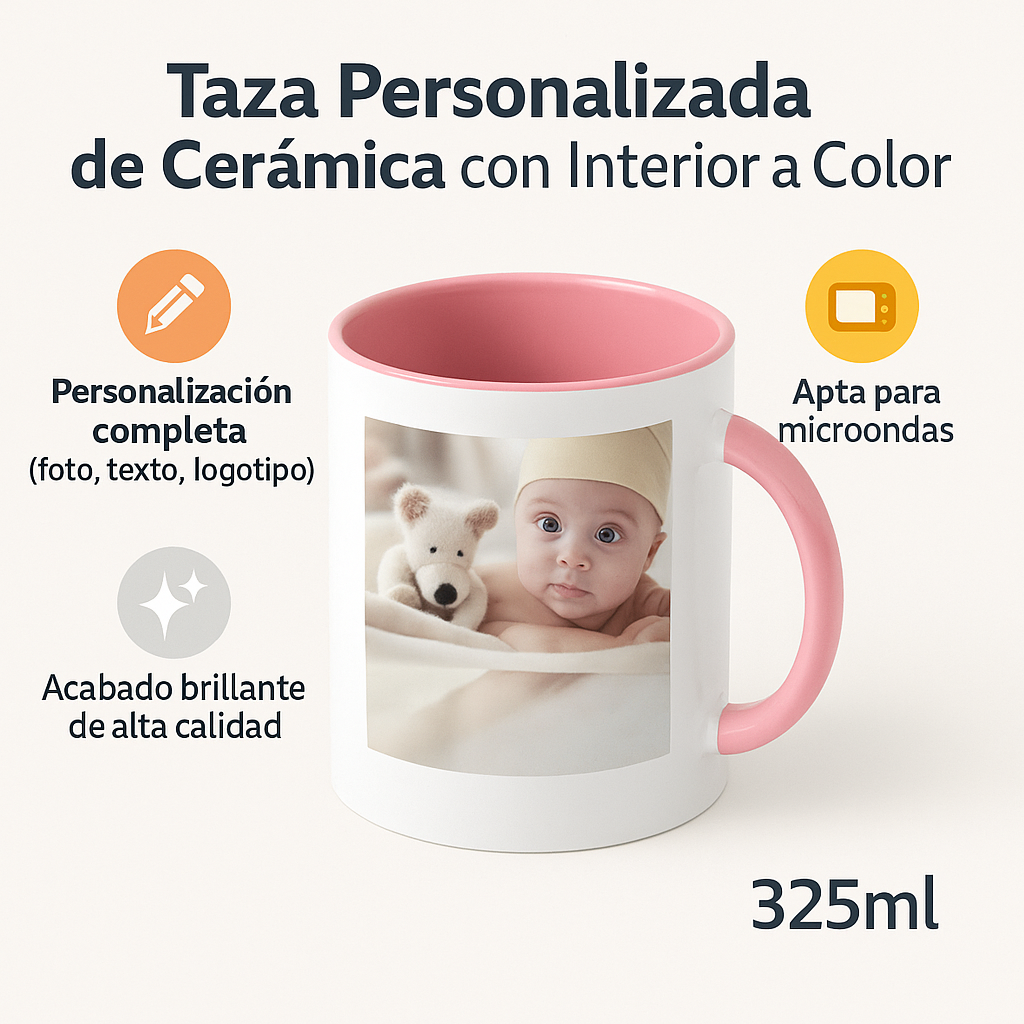 Es una taza de cerámica importada de alta resistencia con interior y asa de color (disponible en 10 tonos como rosa, negro, rojo o azul). A diferencia de las tazas comunes, permite una personalización full color mediante sublimación que no se borra, siendo totalmente apta para microondas y lavados frecuentes. Es el equilibrio perfecto entre un regalo emotivo y un producto de uso diario duradero.