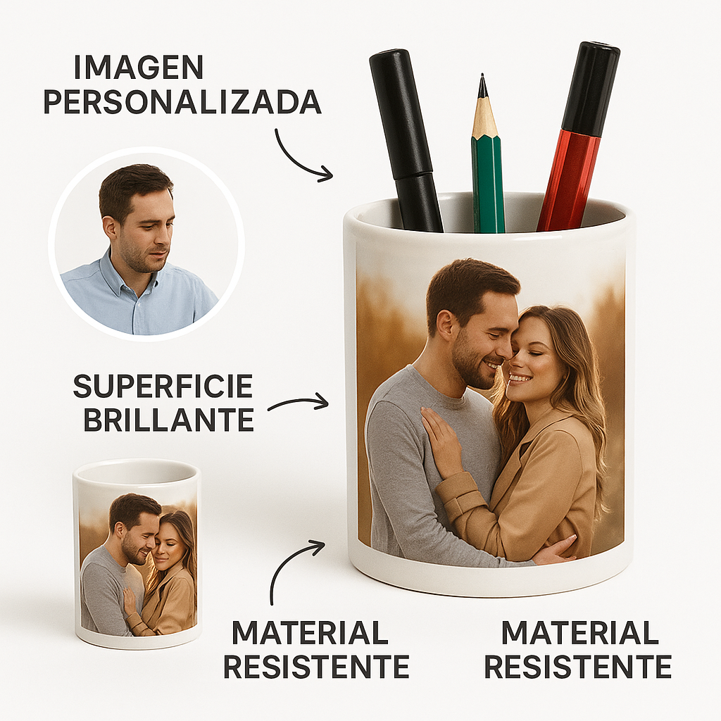 El vaso lapicero personalizado de polímero de TecPic Store es el organizador de escritorio definitivo. Con medidas de 9x8 cm y capacidad de 450 cc, te permite estampar fotos, frases o el logo de tu marca con calidad fotográfica. Es ultra resistente, soporta golpes, rayaduras y es apto para lavaplatos.