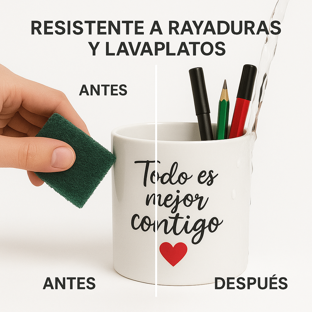 ¡Para nada! Usamos tintas de sublimación que se fijan químicamente al polímero. La impresión es súper duradera, no se raya ni se borra, y es totalmente apta para lavaplatos.
