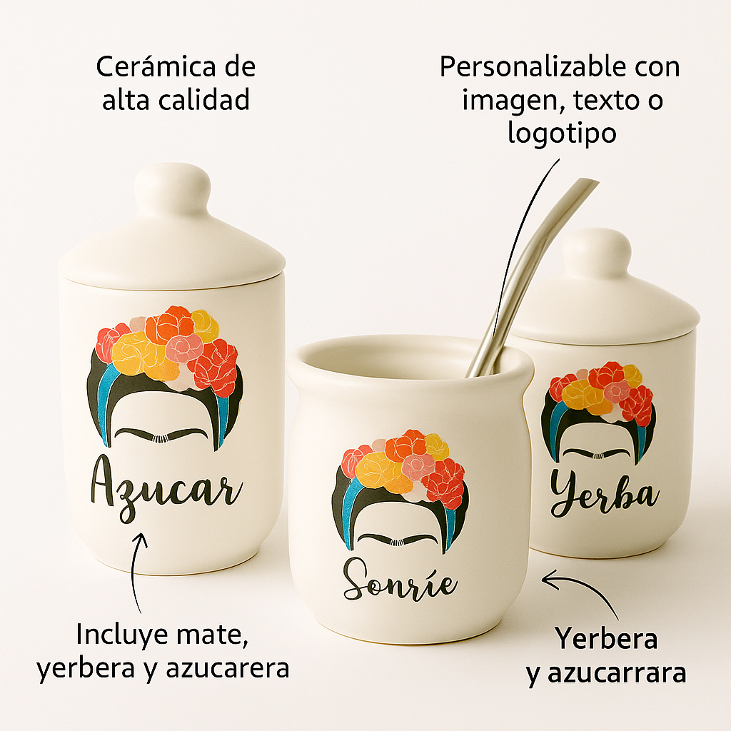 El Set de Mate de Cerámica Personalizado de TecPic Store es un kit completo que incluye mate, yerbera y azucarera con tapa, junto a una bombilla de acero inoxidable. Fabricado en cerámica de alta calidad, te permite estamparle fotos, frases o tu logo para crear un regalo verdaderamente original.